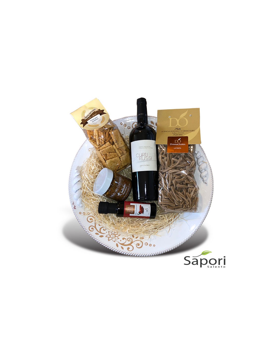 Confezione formata da prodotti Agroalimentari Salentini e un Centrotavola Porta Frutta tondo in Terracotta lavorato interamente a mano da Maestri Salentini con la tecnica del graffiato.