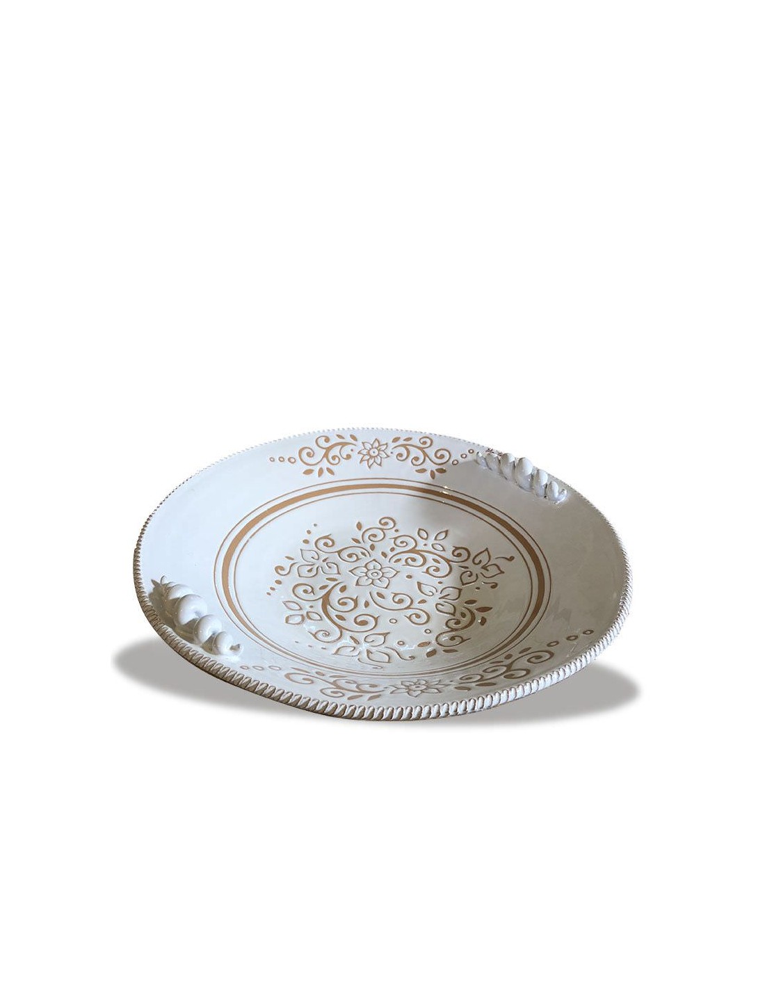 Set composto da prodotti Agroalimentari Made in Salento e un Centrotavola Porta Frutta tondo in Terracotta colore bianco decorato a mano con la tecnica del graffiato.