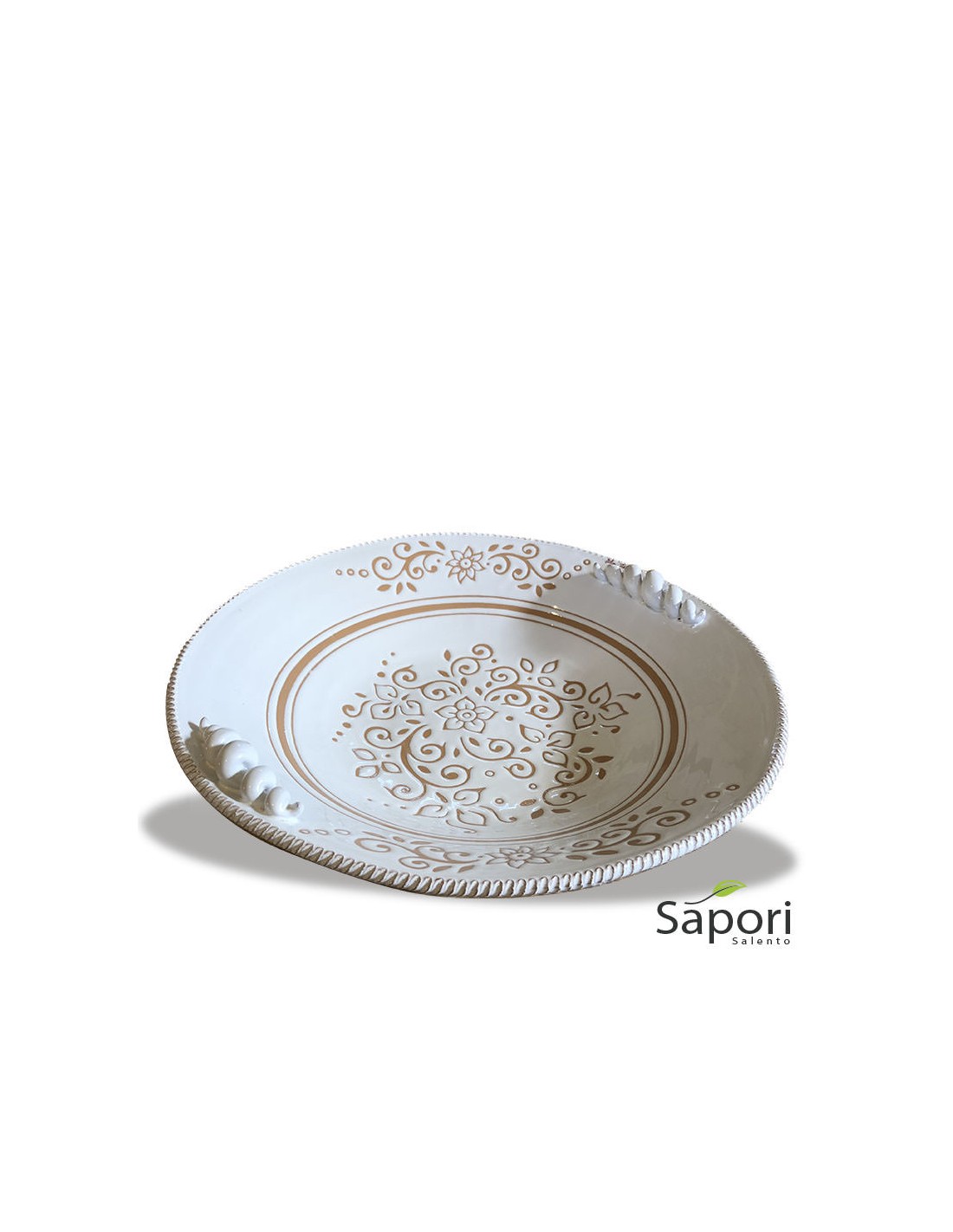 - Centrotavola tondo con manici in terracotta smaltata bianca e disegno fatto a incisione nel smalto e ricoperto con cristallina.