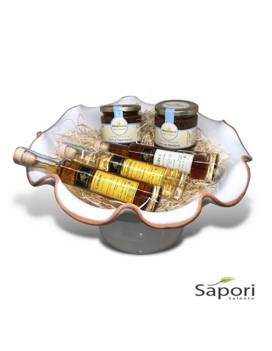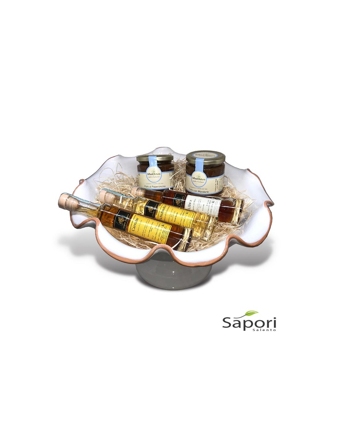Confezione formata da prodotti Agroalimentari Salentini e un Centrotavola Porta Frutta alto in Terracotta lavorato interamente a mano da Maestri Salentini con la tecnica del graffiato.
