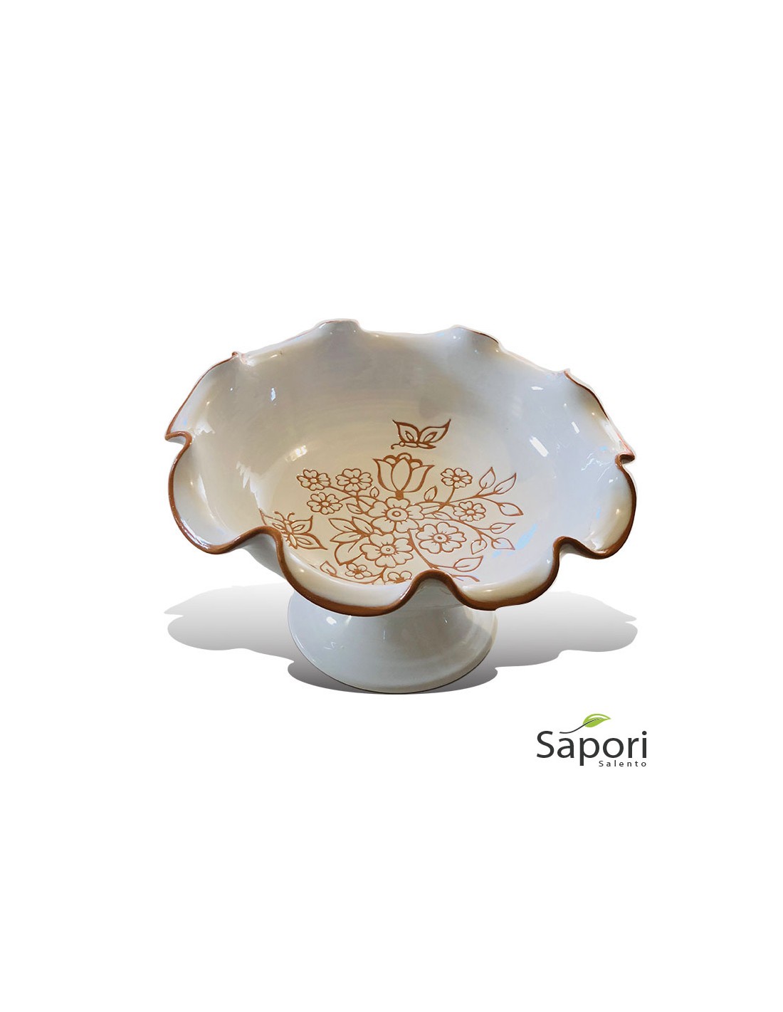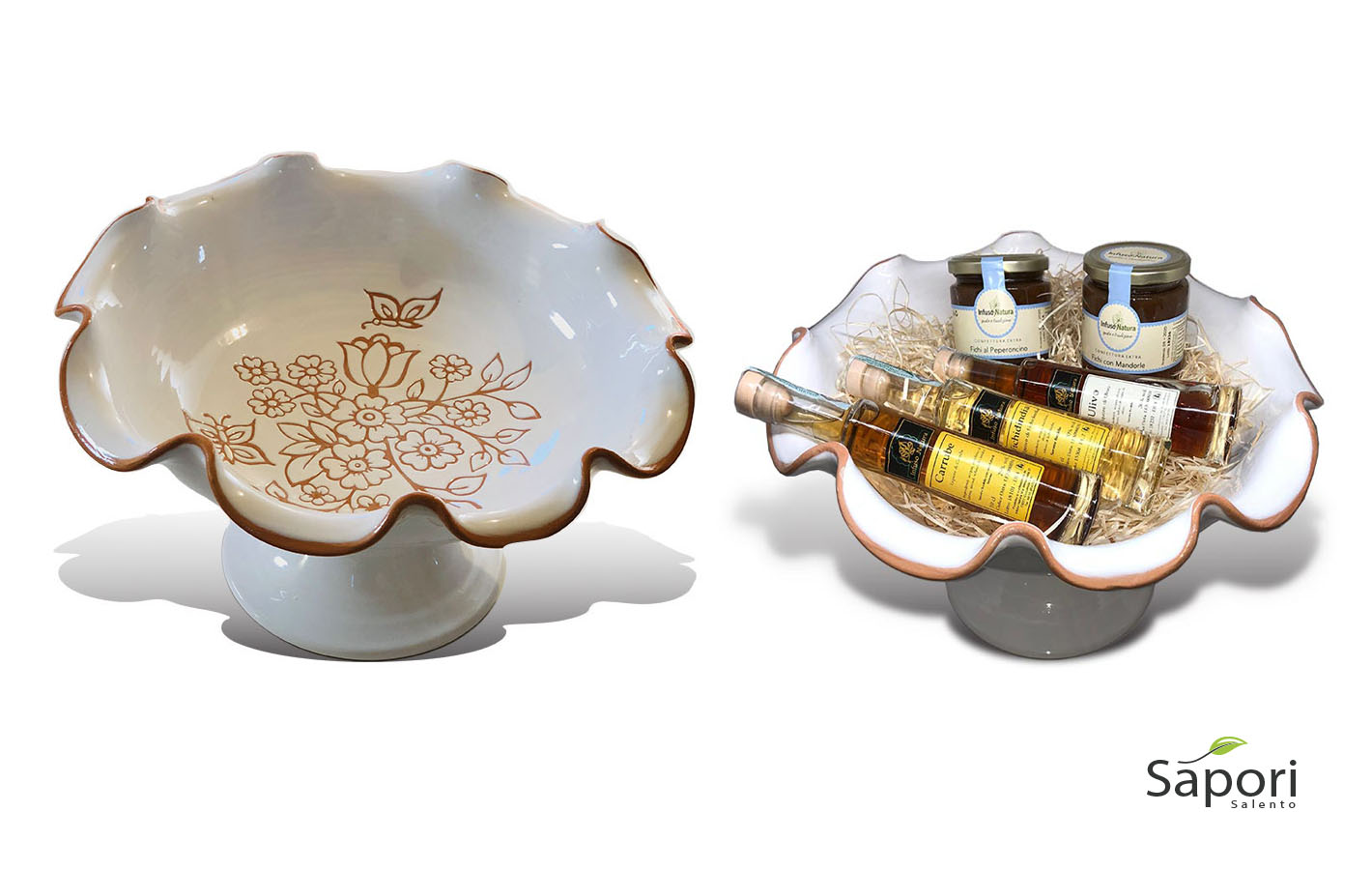 Set composto da prodotti Agroalimentari Made in Salento e un Centrotavola Porta Frutta alto in Terracotta colore bianco decorato a mano con la tecnica del graffiato.