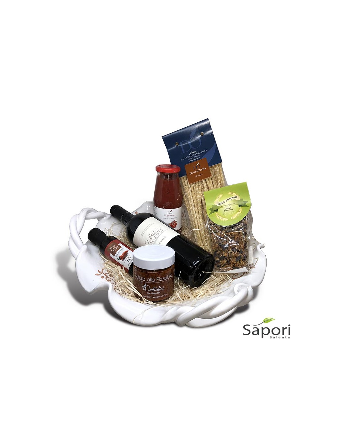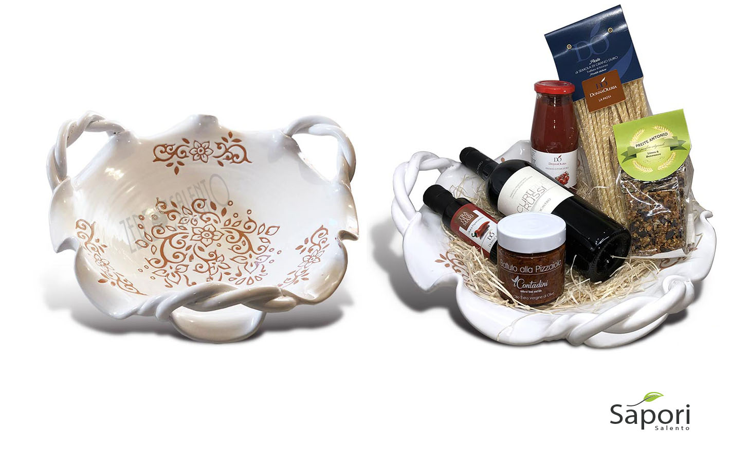 Confezione formata da prodotti Agroalimentari Salentini e un Centrotavola Porta Frutta con tre manici intrecciati in Terracotta Artigianale lavorato interamente a mano da Maestri Salentini.