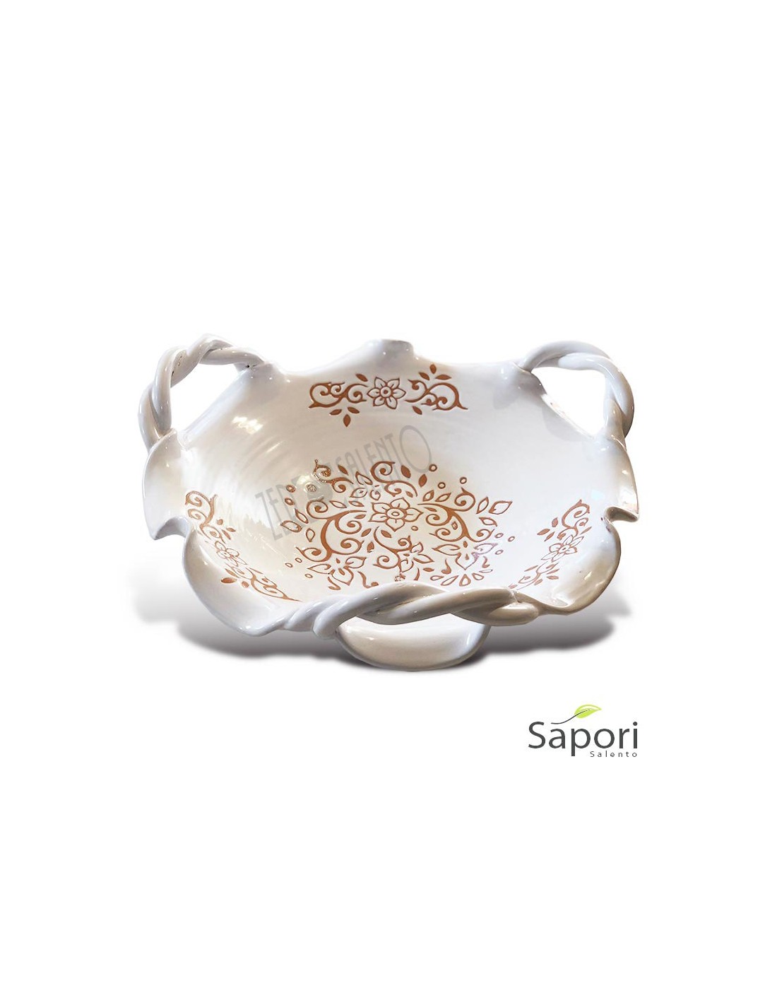 Set composto da prodotti Agroalimentari Made in Salento e un Centrotavola Porta Frutta con tre manici intrecciati in Terracotta colore bianco decorato a mano con la tecnica del graffiato.