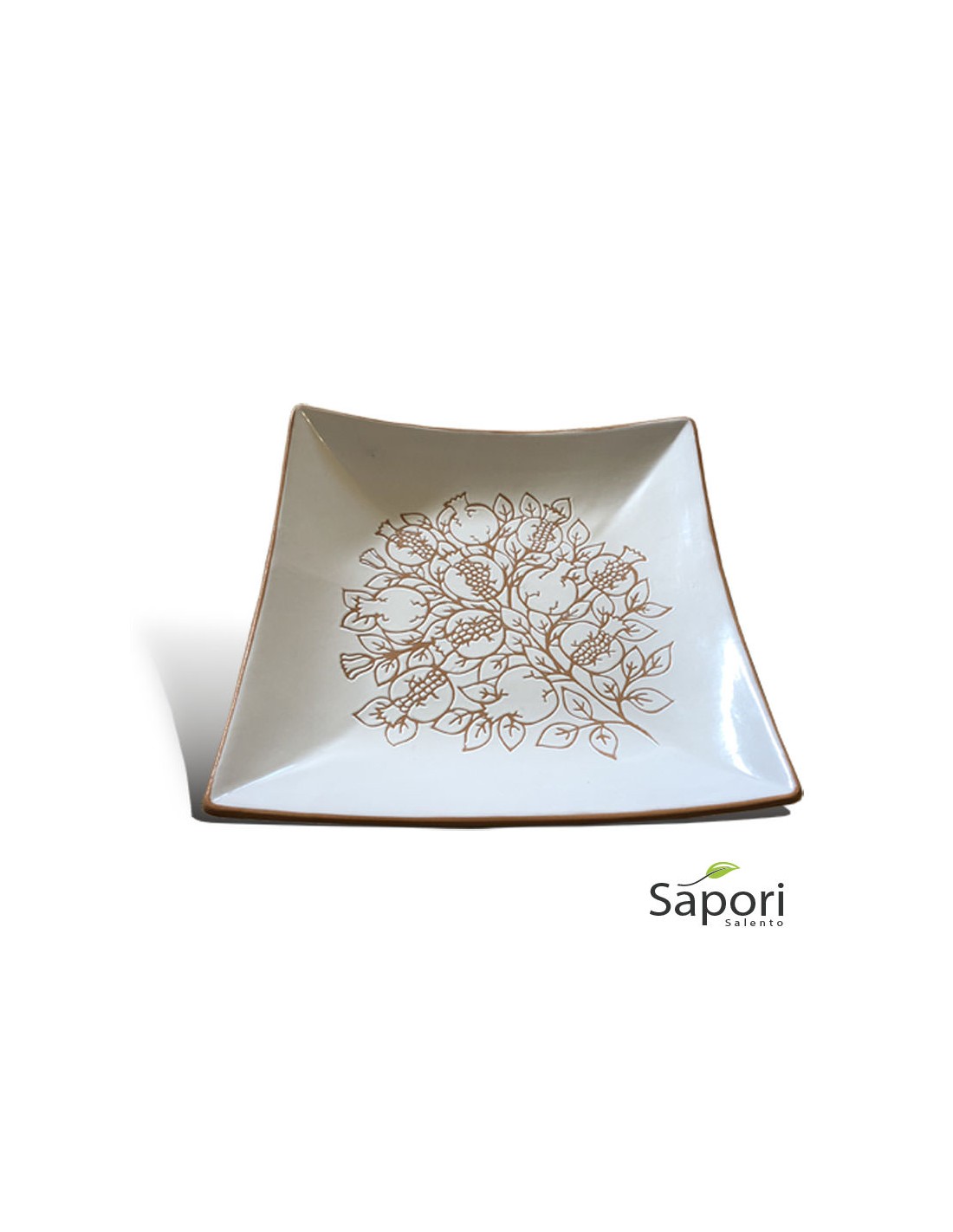 Set composto da prodotti Agroalimentari Made in Salento e un Centrotavola Porta Frutta quadrato stile moderno in Terracotta colore bianco decorato a mano con la tecnica del graffiato.